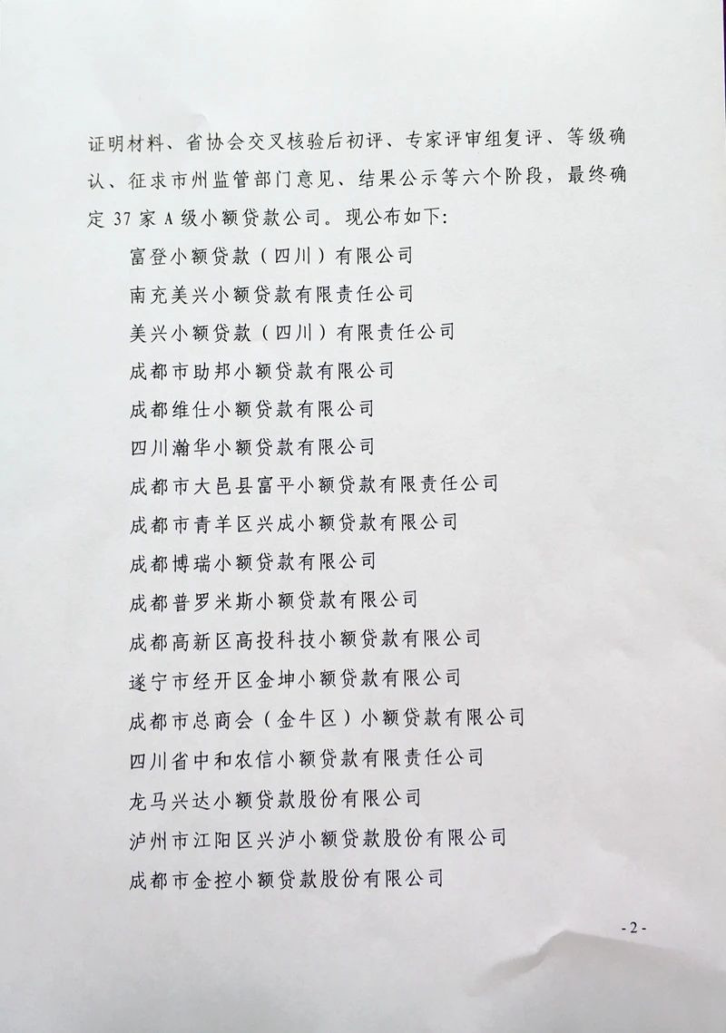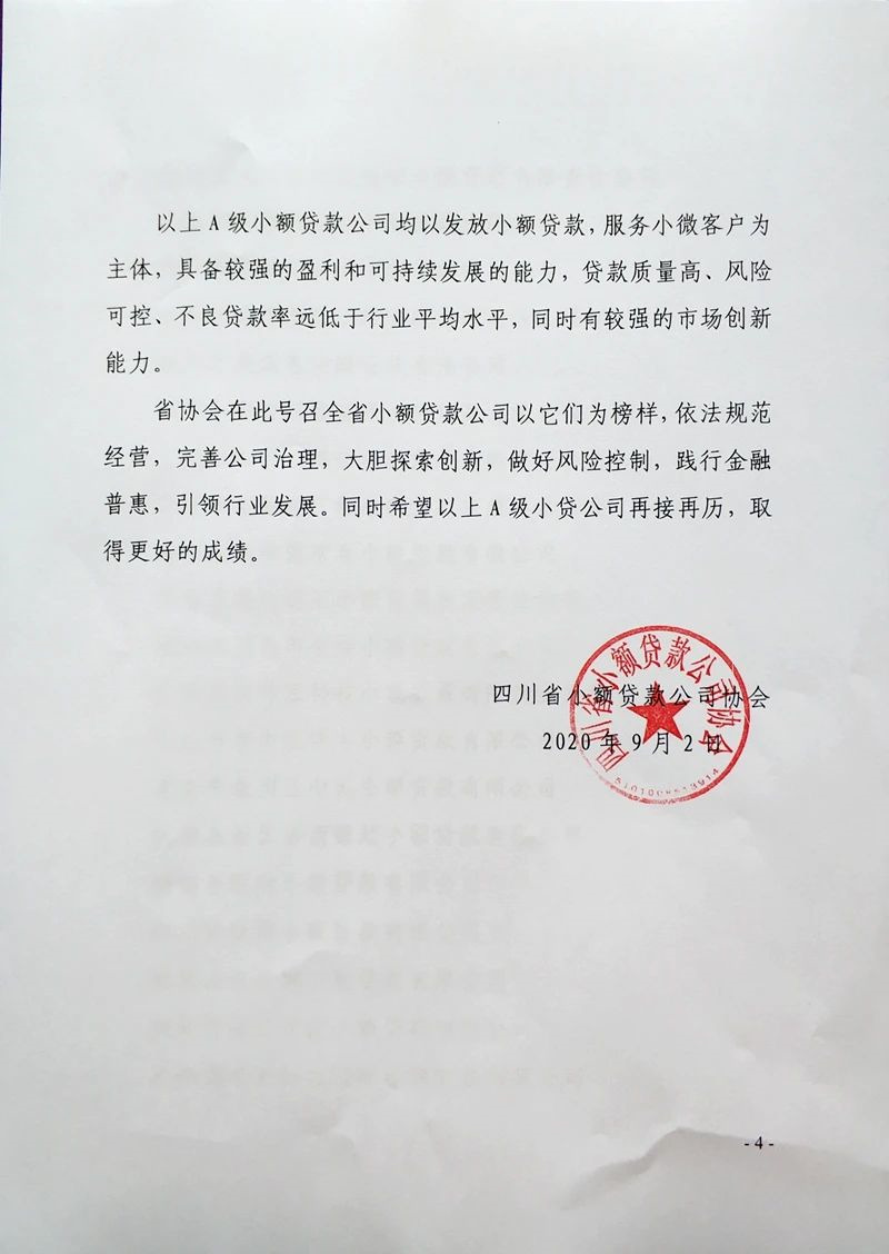 近日,四川省小额贷款公司2018-2019年度行业评级结果公布,我市23家小额贷款公司获评A级!!!
