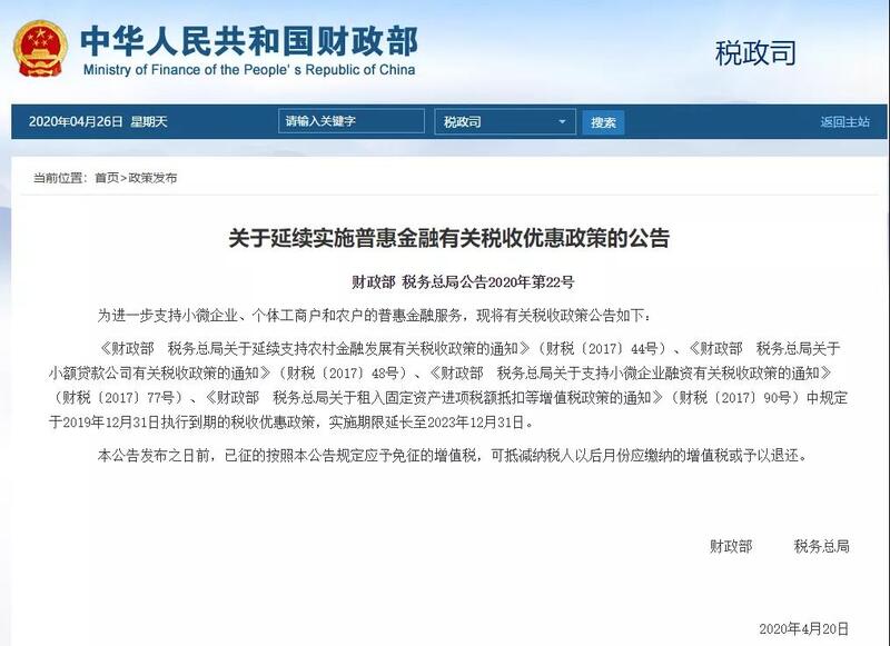 《财政部 税务总局关于延续支持农村金融发展有关税收政策的通知》(财税〔2017〕44号)、《财政部 税务总局关于小额贷款公司有关税收政策的通知》(财税〔2017〕48号)、《财政部 税务总局关于支持小微企业融资有关税收政策的通知》(财税〔2017〕77号)、《财政部 税务总局关于租入固定资产进项税额抵扣等增值税政策的通知》(财税〔2017〕90号)中规定于2019年12月31日执行到期的税收优惠政策,实施期限延长至2023年12月31日。