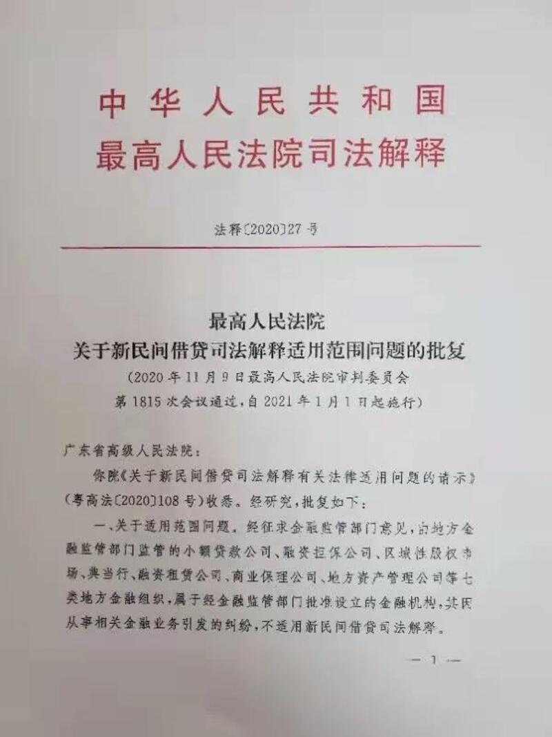 最高法院于2020年12月29日关于新民间借贷司法解释适用范围问题批复广东高院,明确:由地方金融监管部门监管的小额贷款公司、融资担保公司、区域性股权市场、典当行、融资租赁公司、商业保理公司、地方资产管理公司等七类地方金融组织,属于经金融监管部门批准设立的金融机构,其因从事相关金融业务引发的纠纷,不适用新民间借贷司法解释。其他问题已在修订后的司法解释中予以明确。批复自2021年1月1日起施行。