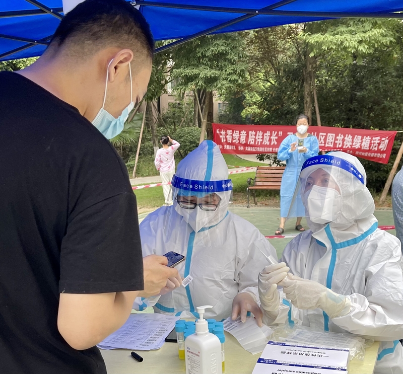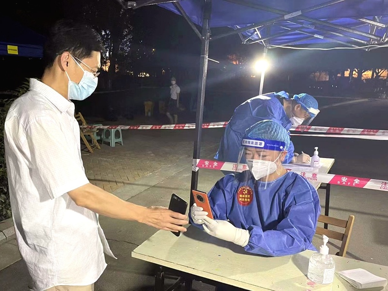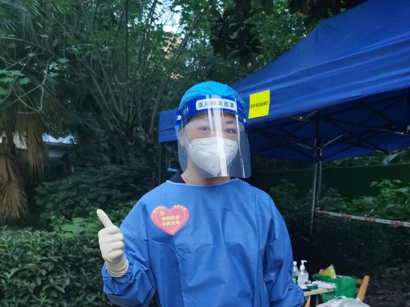 她主要负责采样点信息扫码录入工作,穿防护服是她化身“大白”的第一步。连日来高温酷暑,她戴着N95口罩、橡胶手套并穿着密不透风的防护服,持续不断地工作在防疫一线。很多时候核酸检测会做到晚上10点多,有时候还需要和医务人员一起上门为行动不便的居民做检测,但是她都无怨无悔。脱掉防护服,她的双手已被汗水浸泡的皱巴巴的。她在工作中表现出的敬业、热情和耐心得到了社区和居民们的赞扬和肯定。