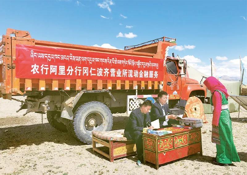 近年来,一些银行积极探索,提高金融服务的可得性、覆盖率和满意度,打通金融服务“最后一公里”,有效地推动了普惠金融的发展。中国农业银行在西藏地区充分运用“背包银行”、“马背银行”、“汽车银行”等方式开展流动金融服务,让农牧民“足不出村”就能享受到便捷高效的金融服务。图为农行阿里分行冈仁波齐营业所工作人员在为农牧民办理贷款证年审业务。 中国农业银行供图 巴桑次仁/摄
