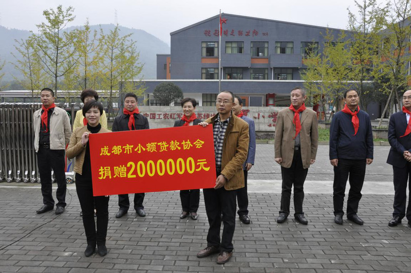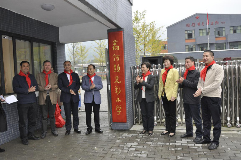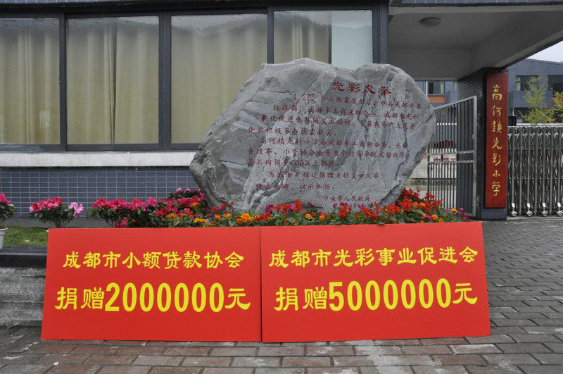 邛崃市高何镇光彩小学原教学楼在“4·20”芦山地震中受损,列入灾后重建项目。市委统战部、市工商联、市光彩事业促进会共同发出倡议,号召全市广大民营企业积极参与抗震救灾,成都市工商联会员、光彩会理事、小贷协会会员以及中欧商学院成都班学员共同捐资700万元,其中成都市小额信贷协会会员单位共捐赠200万元,用于学校灾后迁址恢复重建。该工程项目于2014年6月开工建设,2014年底完工。新建项目包含2960平方米的学校校舍和配套完善的校门、道路、围墙等总平附属设施,以及200米标准化运动场、300平方米乒乓球馆等,目前均已全部建成并投入使用。