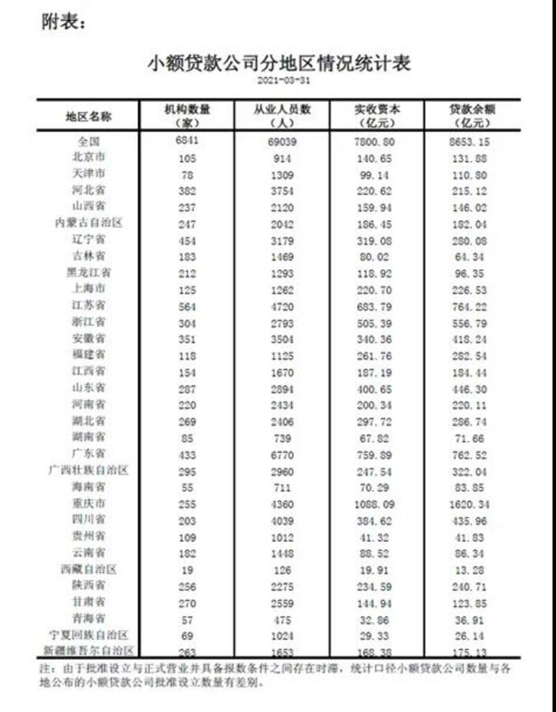 截至2021年3月末,全国共有小额贷款公司6841家。贷款余额8653亿元,一季度减少212亿元。