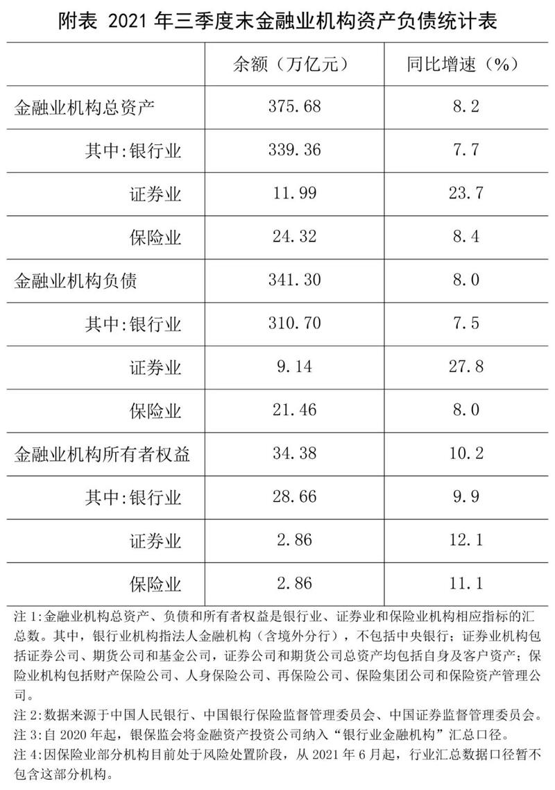 初步统计,2021年三季度末,我国金融业机构总资产为375.68万亿元,同比增长8.2%,其中,银行业机构总资产为339.36万亿元,同比增长7.7%;证券业机构总资产为11.99万亿元,同比增长23.7%;保险业机构总资产为24.32万亿元,同比增长8.4%。