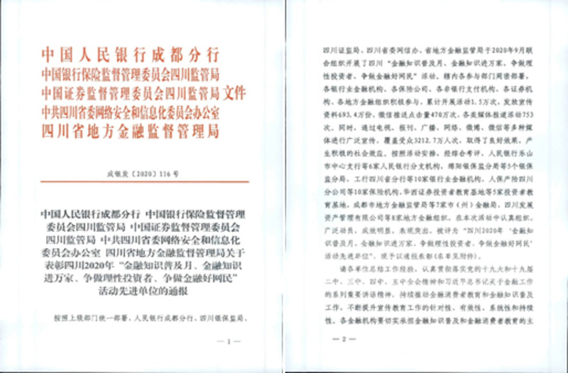 2020年12月31日,在人民银行成都分行、四川银保监局、四川证监局、四川省委网信办、省地方金融监管局联合组织开展的四川2020年“金融知识普及月 金融知识进万家 争做理性投资者 争做金融好网民”活动中,兴文科贷被评为四川2020年“金融知识普及月”活动先进单位。