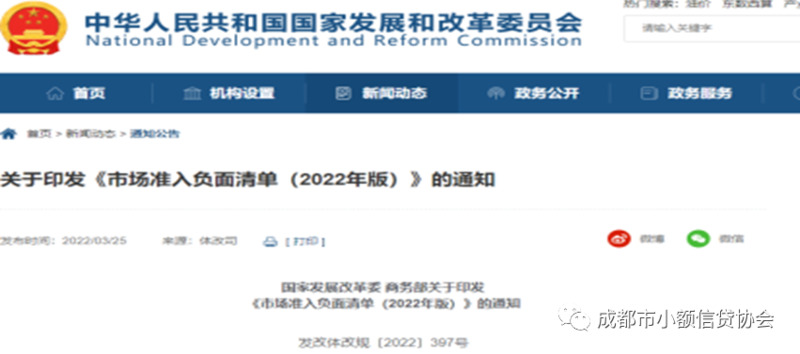 ■ 国家发改委:《市场准入负面清单(2022年版)》发布,明确:未获许可不得设立小额贷款公司