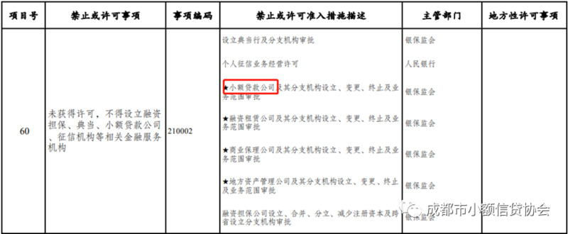 在许可准入类中明确,未获得许可,不得设立融资租赁、融资担保、典当、小额贷款公司、征信机构等相关金融服务机构。小额贷款公司及其分支机构设立、变更、终止及业务范围均须监管部门审批。