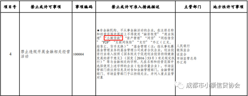 在禁止准入类中,特别强调了禁止违规开展金融相关经营活动,其中包括非金融机构、不从事金融活动的企业,在注册名称和经营范围中不得使用“小额贷款”字样,使用此字样的企业(包括存量企业)将列入重点监管对象。