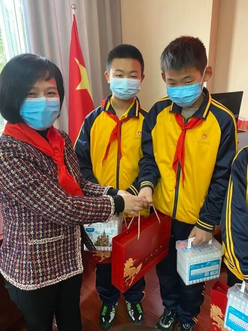 捐赠仪式后,受协会向忠会长委托,由协会秘书长朱丹代表协会向受助学生赠送学习用品,鼓励他们好好学习,不惧困难,奋发向上。