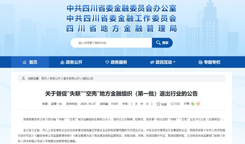 我局前期发布三批《四川省“失联”“空壳”地方金融组织名单的公示》,现均已公示期满。经研究,现将第一批认定的“失联”“空壳”企业予以公告(名单附后)。