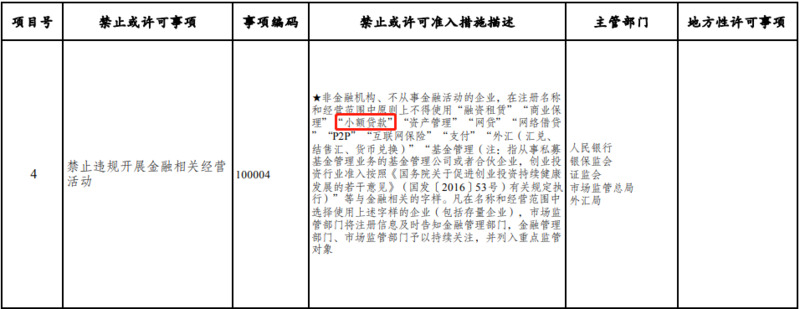 在禁止准入类中,特别强调了禁止违规开展金融相关经营活动,其中包括非金融机构、不从事金融活动的企业,在注册名称和经营范围中不得使用“小额贷款”字样,使用此字样的企业(包括存量企业)将列入重点监管对象。