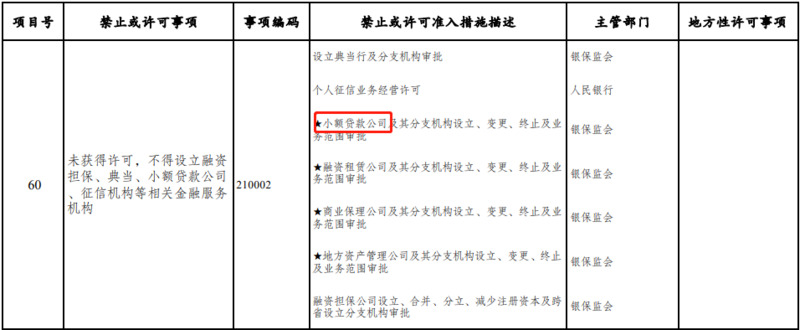 在许可准入类中明确,未获得许可,不得设立融资租赁、融资担保、典当、小额贷款公司、征信机构等相关金融服务机构。小额贷款公司及其分支机构设立、变更、终止及业务范围均须监管部门审批。