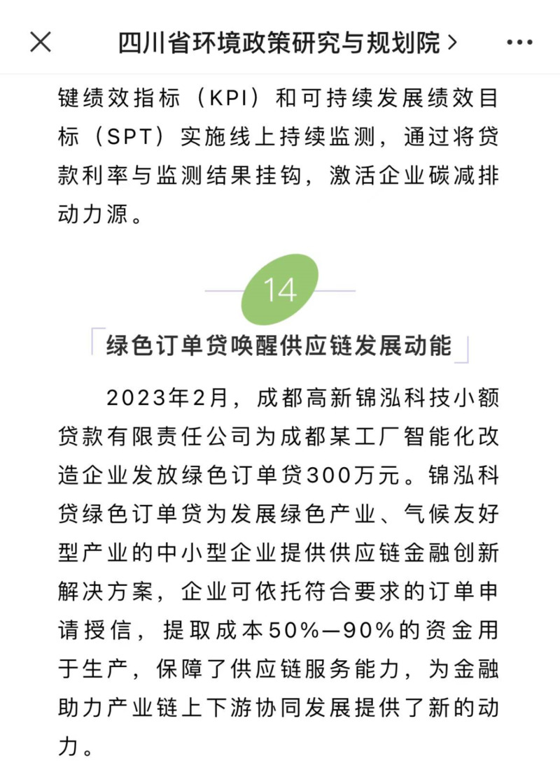 四川省环境政策研究与规划院是四川省生态环境厅下属环境政策与规划智库,立足于服务全省生态环境保护中心任务和经济高质量发展,为四川省绿色产业建设与发展成果提供决策参考和技术支撑。经过专家审查筛选,本次共有宜宾携宁德时代打造“世界动力电池之都”、成都联合“三州一市”为绿色产业建圈强链等20个案例入围,此次入选是对锦泓科贷专业度以及创新性的认可,也是对锦泓长期深耕中小微科创企业服务的肯定。