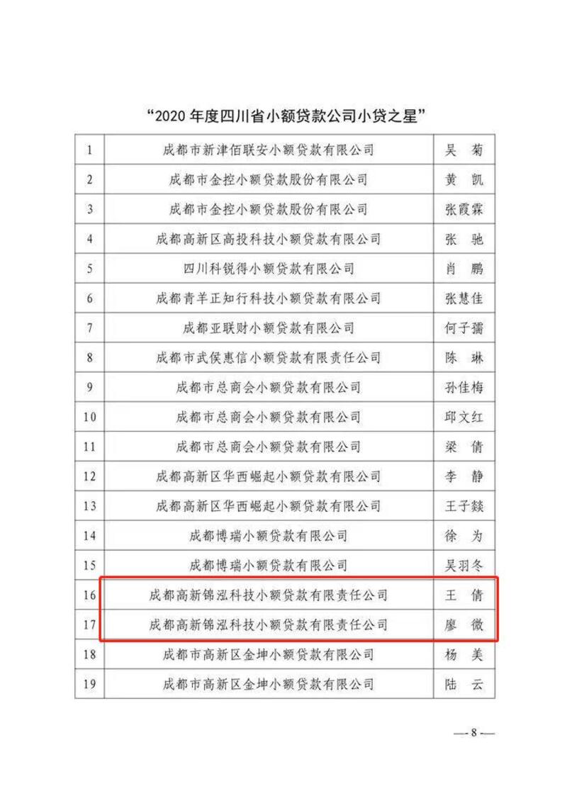 近日,四川省小额贷款公司行业协会公布“2020年度四川省小额贷款公司行业优秀企业和个人评选”活动的获奖情况。本次评选根据川内近300家小贷公司经营质量等多项指标进行择优评选,并经专家组评定确认。