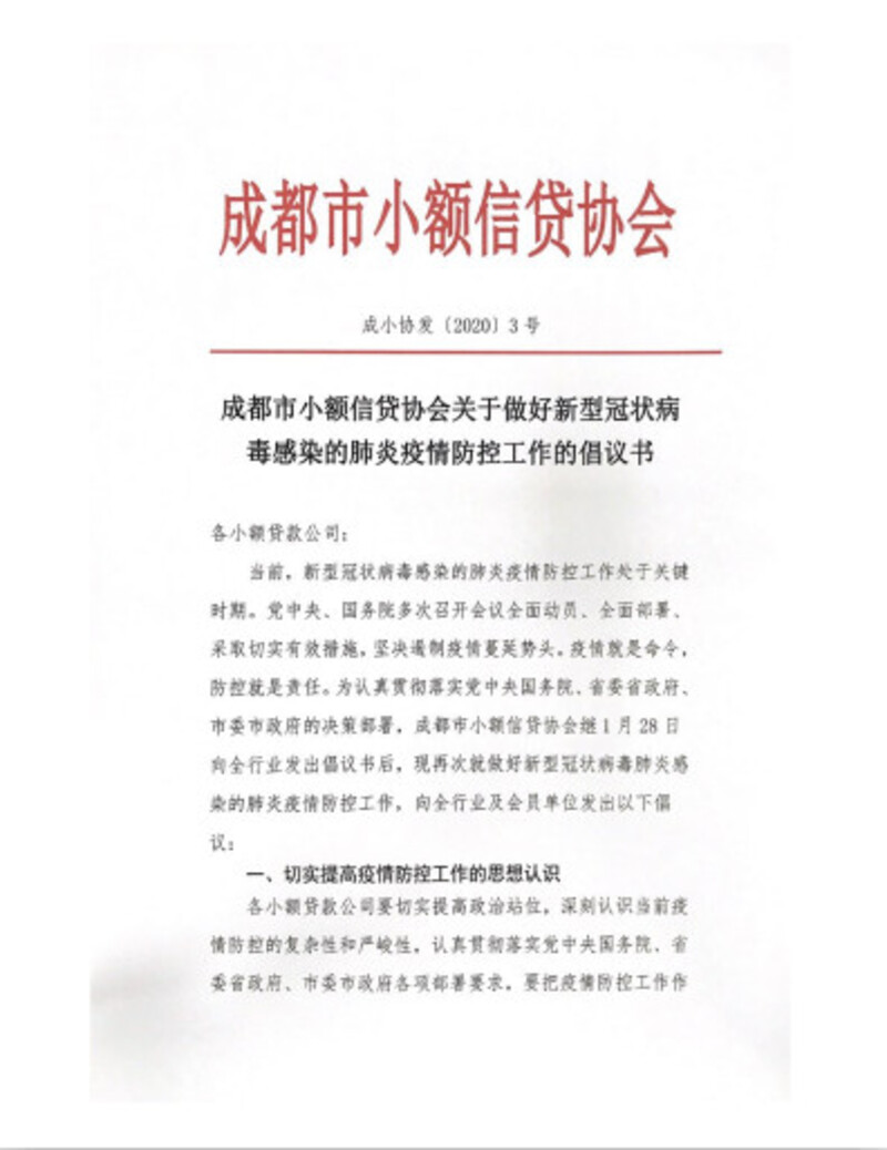 2月3日,成都市小额信贷协会发出《关于做好新型冠状病毒肺炎疫情防控工作的倡议书》,倡议成都市各小额贷款公司做好相关金融服务工作,加大对疫情防控相关企业的信贷支持力度,以及做好受困企业差异化金融服务工作。同时号召小贷公司积极发扬大爱精神,动员公司员工通过正规渠道开展捐赠活动,积极为疫情防控纾困解难。