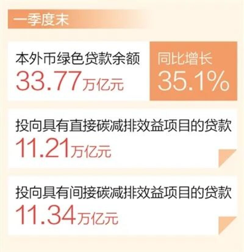 本报北京5月19日电 近日,中国人民银行发布最新数据显示:今年一季度,我国绿色贷款保持高速增长,截至一季度末,本外币绿色贷款余额33.77万亿元,同比增长35.1%,高于各项贷款增速25.9个百分点,一季度增加3.7万亿元,季度增量创历史新高。其中,投向具有直接和间接碳减排效益项目的贷款分别为11.21万亿元和11.34万亿元,合计占绿色贷款的66.8%。