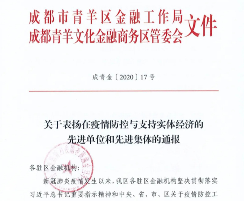 2020年4月29日,为表彰先进、树立典型,成都市青羊区金融工作局联合成都青羊文化金融商务区管委会,对成都市青羊区兴成小额贷款有限公司等45家为疫情防控和经济社会发展双胜利做出贡献的先进单位予以通报表扬。
