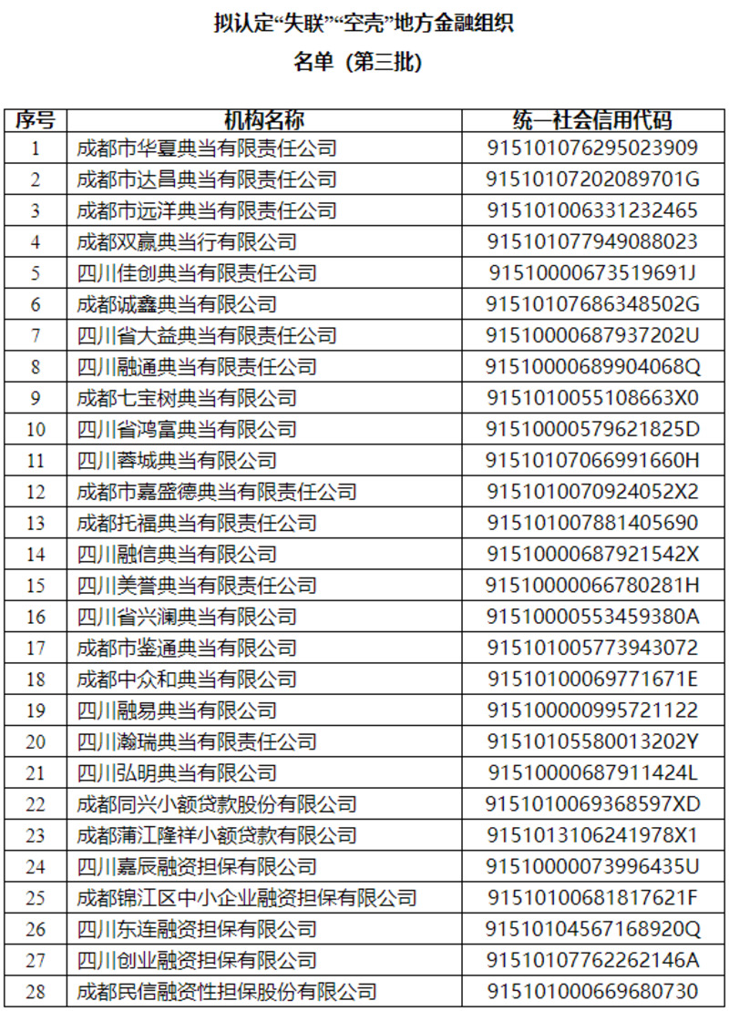 为深入贯彻落实中央金融工作会议精神,按照全国统一部署,我局会同省市场监管局,组织各地相关部门对地方金融组织“失联”“空壳”开展排查。根据有关标准和工作要求,现对“失联”“空壳”地方金融组织名单(第三批)进行公示。如有异议请在公示期内以书面形式向我局反映。