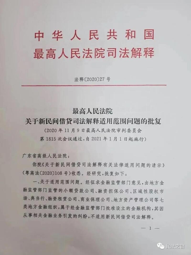 你院《关于新民 间借贷司法解释有关法律适用问题的请示》(粤高法〔2020〕108 号)收悉。经研究,批复如下∶
