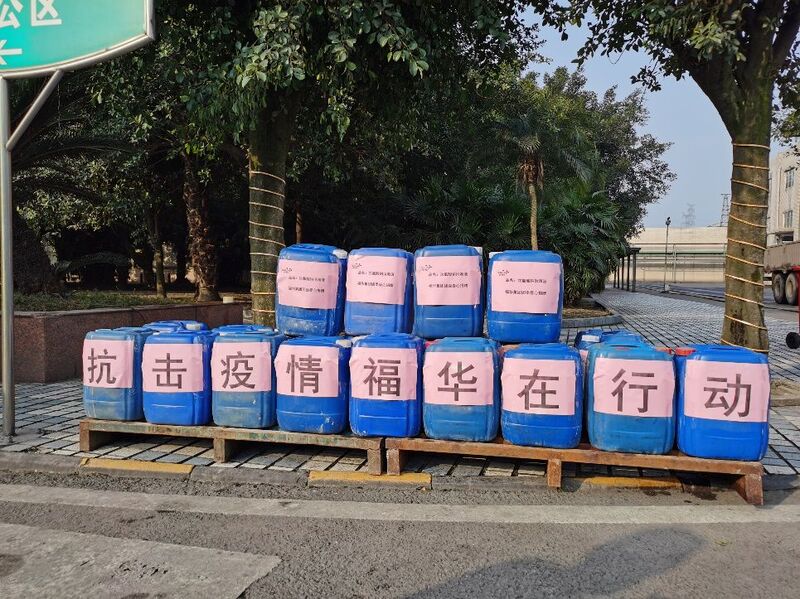 福华集团积极响应党委和政府号召,在保障安全环保工作前提下,主动加大双氧水、次氯酸钠、二氧化氯等消杀产品的生产量,开通捐赠渠道,免费向乐山市内单位、机构提供消毒杀菌产品。