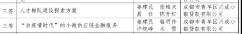 为总结和推广应用企业管理现代化创新成果,提高企业自主创新能力和科学管理理论水平,经各区(市)县经信局、企业联合会(企业家协会)及各行业协会推荐,成都市企业管理现代化创新成果审定委员会组织开展了2021年企业管理现代化创新成果和优秀论(著)文评选工作。兴成小贷两篇创新成果论文:《人才梯队建设探索方案》及《“后疫情时代”的小微供应链金融服务》在本次评选活动中荣获三等奖。