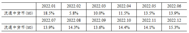 注4:自2022年12月起,“流通中货币(M0)”含流通中数字人民币。12月末流通中数字人民币余额为136.1亿元。修订后,2022年各月末M1、M2增速无明显变化。修订后M0增速如下: