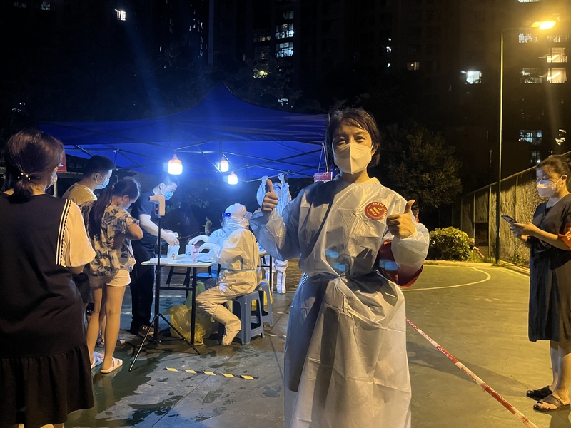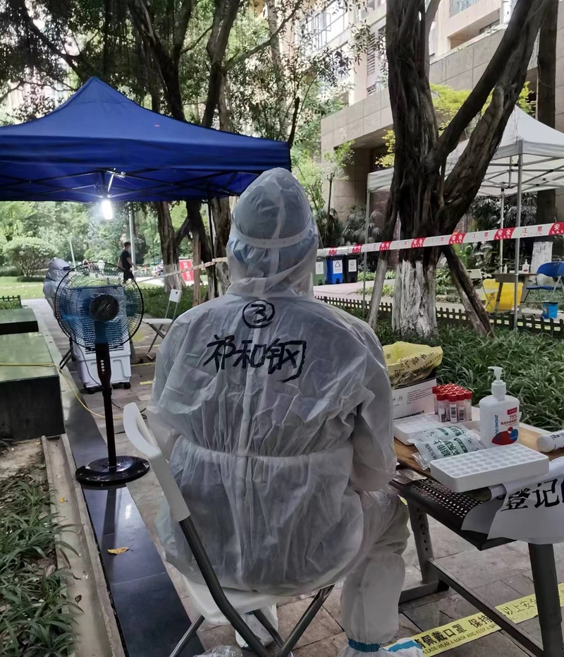 她主要负责采样点信息扫码录入工作,穿防护服是她化身“大白”的第一步。连日来高温酷暑,她戴着N95口罩、橡胶手套并穿着密不透风的防护服,持续不断地工作在防疫一线。很多时候核酸检测会做到晚上10点多,有时候还需要和医务人员一起上门为行动不便的居民做检测,但是她都无怨无悔。脱掉防护服,她的双手已被汗水浸泡的皱巴巴的。她在工作中表现出的敬业、热情和耐心得到了社区和居民们的赞扬和肯定。