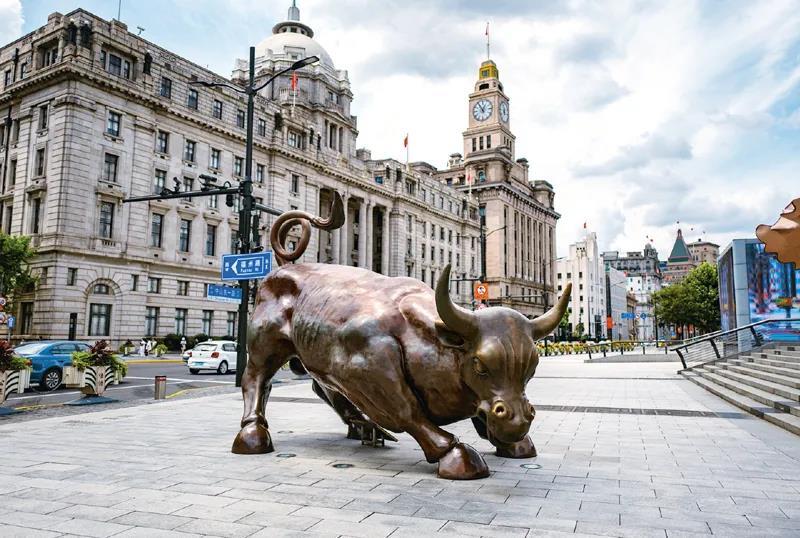 改革开放以来,我国金融业实现历史性跨越,建立起具有自身特色的现代金融体系。《关于进一步加快推进上海国际金融中心建设和金融支持长三角一体化发展的意见》提出了30条具体措施,推动上海成为金融改革开放排头兵。图为2020年7月30日,上海外滩蓝天白云映衬下的外滩牛。 人民图片 王初/摄