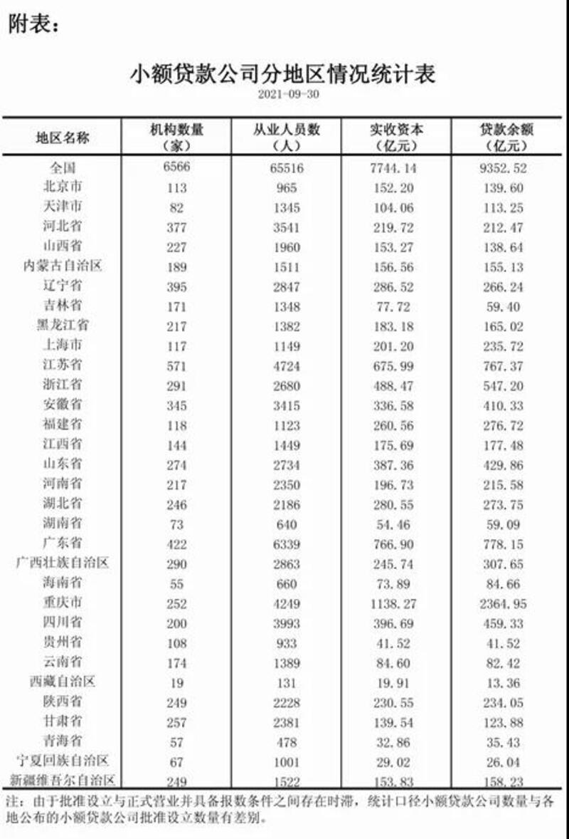 截至2021年9月末,全国共有小额贷款公司6566家。贷款余额9353亿元,前三季度增加488亿元。