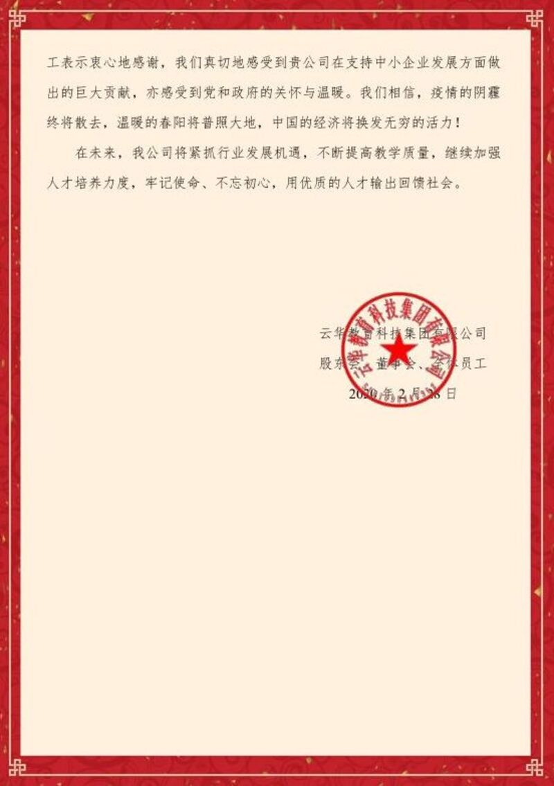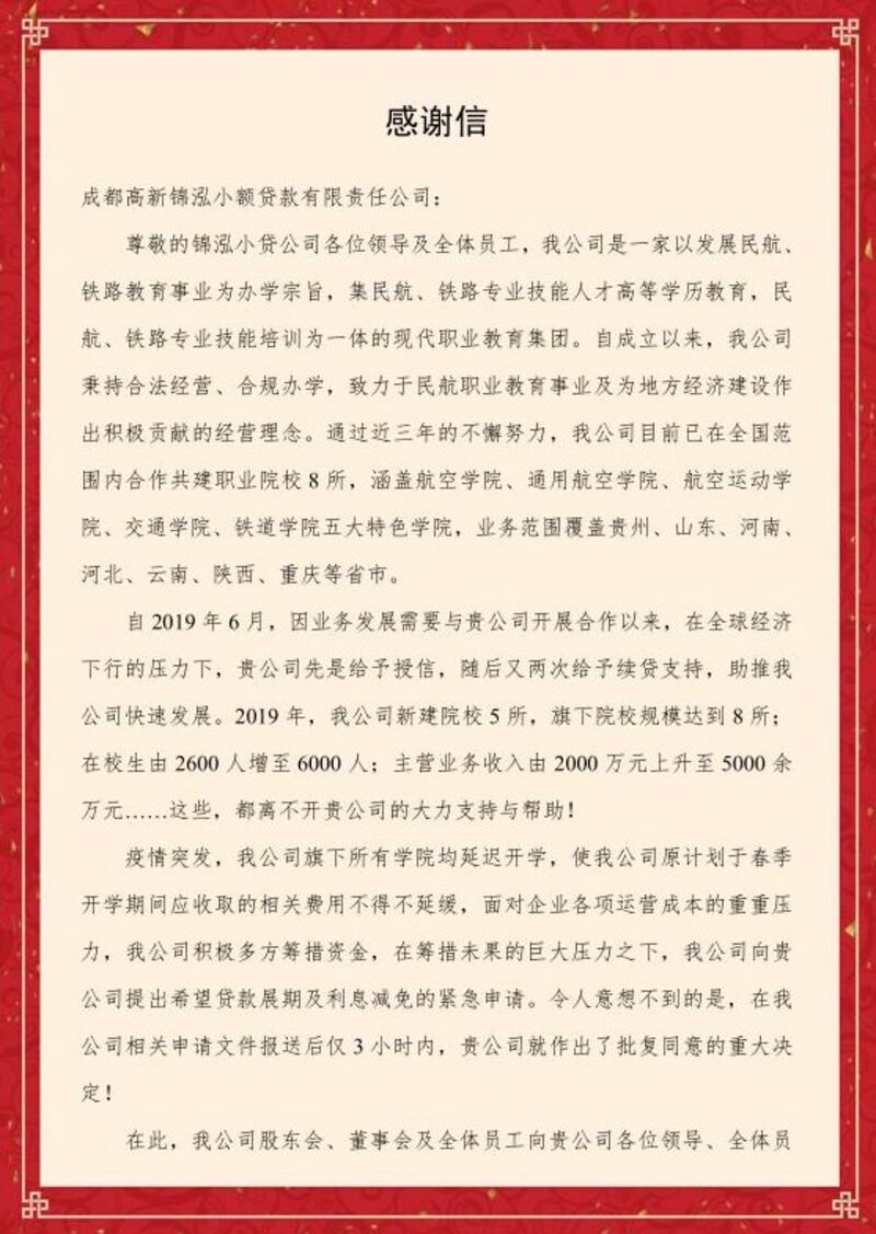 疫情爆发后,锦泓科贷及时主动联系客户了解受疫情影响情况,是否存在还本付息等困难。主动担当作为,全面掌握公司相关帮扶产品政策信息,积极为客户复工复产出谋划策。截止目前,已为1户客户完成正常续贷流程,为1户客户完成利息缓付申请,为2户客户完成无手续展期申请,为3户客户申请针对性利息减免,凭借优质高效的服务,获得了客户云华教育科技集团有限公司的大力赞扬,并收到感谢信。全文如下: