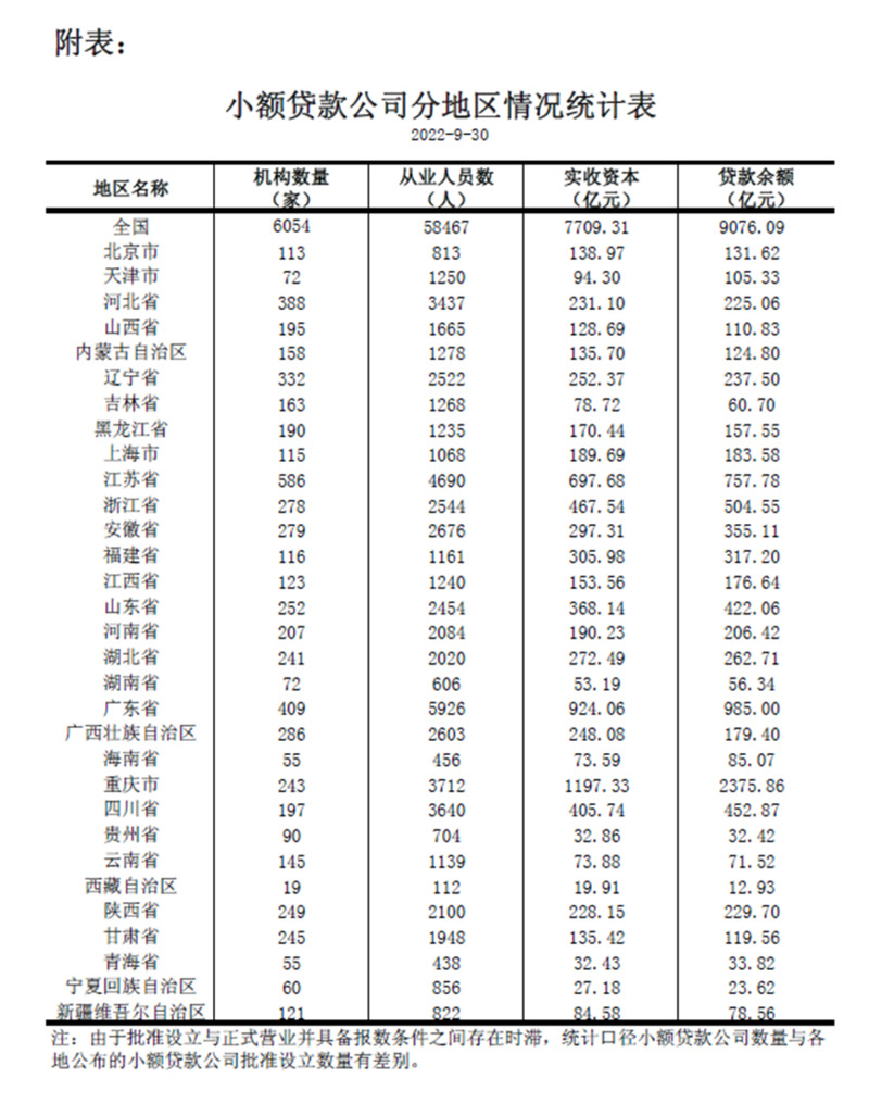 截至2022年9月末,全国共有小额贷款公司6054家。贷款余额9076亿元,前三季度减少347亿元。