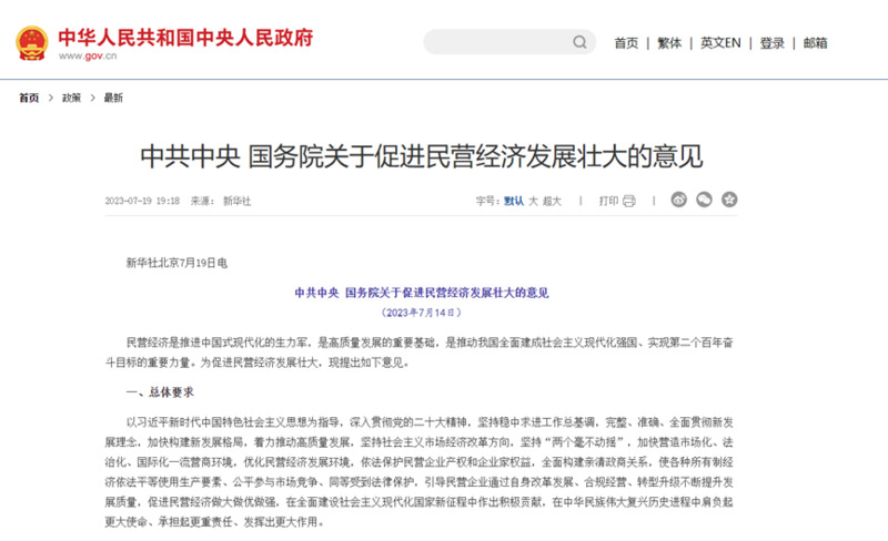 7月19日晚,新华社发布《中共中央 国务院关于促进民营经济发展壮大的意见》(以下简称《意见》)。