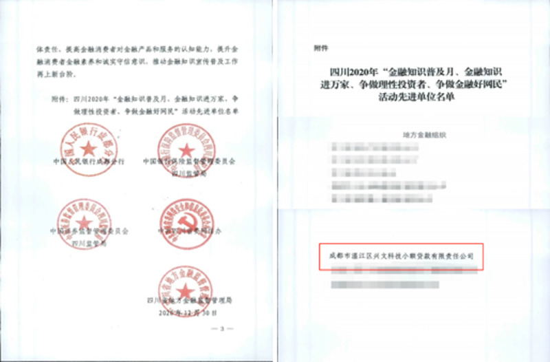 2020年12月31日,在人民银行成都分行、四川银保监局、四川证监局、四川省委网信办、省地方金融监管局联合组织开展的四川2020年“金融知识普及月 金融知识进万家 争做理性投资者 争做金融好网民”活动中,兴文科贷被评为四川2020年“金融知识普及月”活动先进单位。