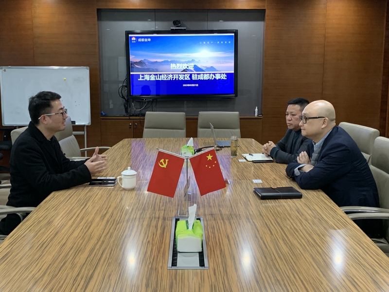 2月21日,上海金山经济开发区驻成都办事处(以下简称“办事处”)副主任程道刚到访成都金坤开展交流座谈,成都金坤执行董事、总经理郑玮主持,副总经理蒲斌到场参加。