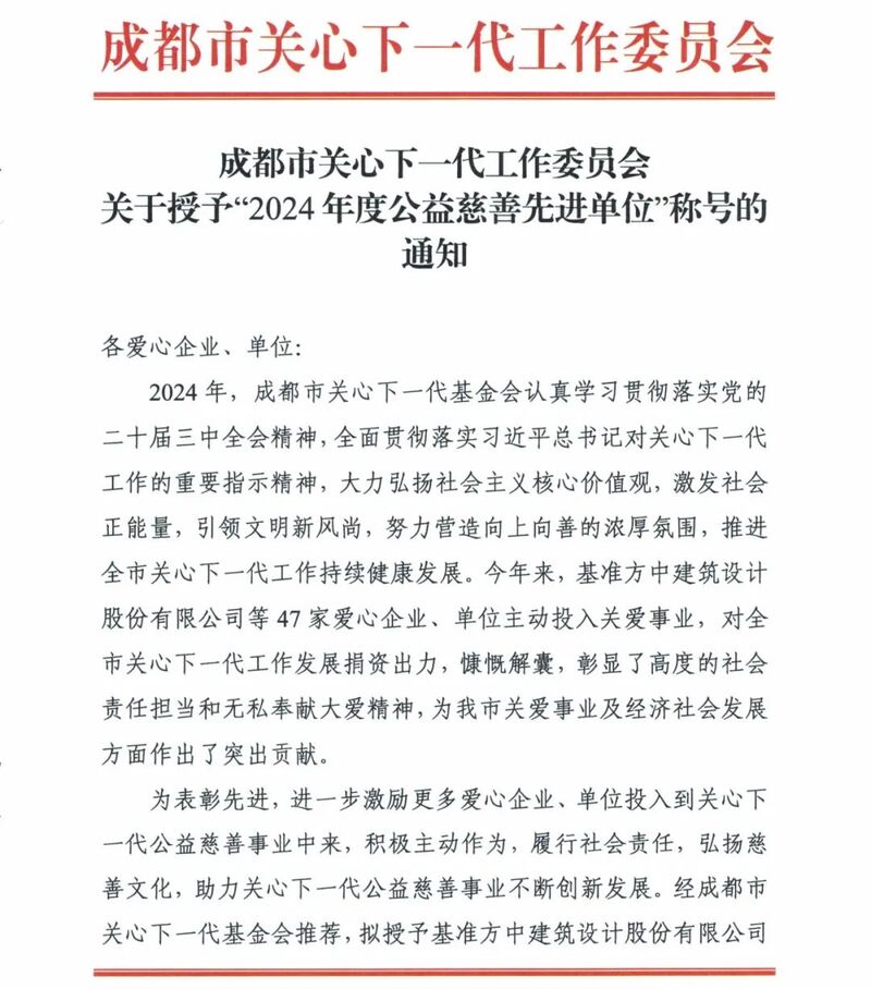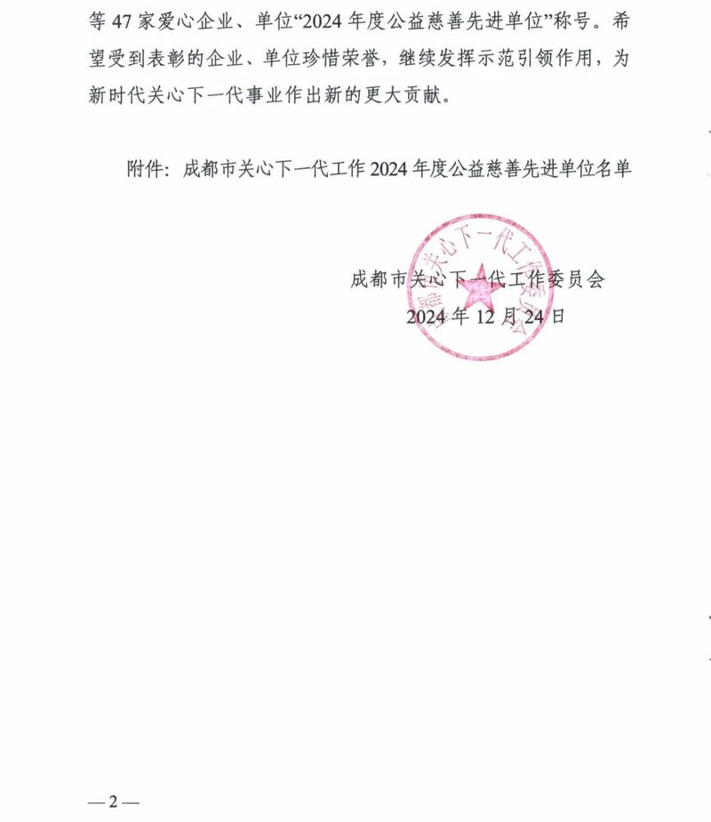 近日,我协会荣获成都市关心下一代工作委员会 “2024 年度公益慈善先进单位” 称号。这一荣誉的背后,是协会和全体会员单位积极主动作为,履行社会责任,弘扬慈善文化,助力关心下一代公益慈善事业不断创新发展的表现。