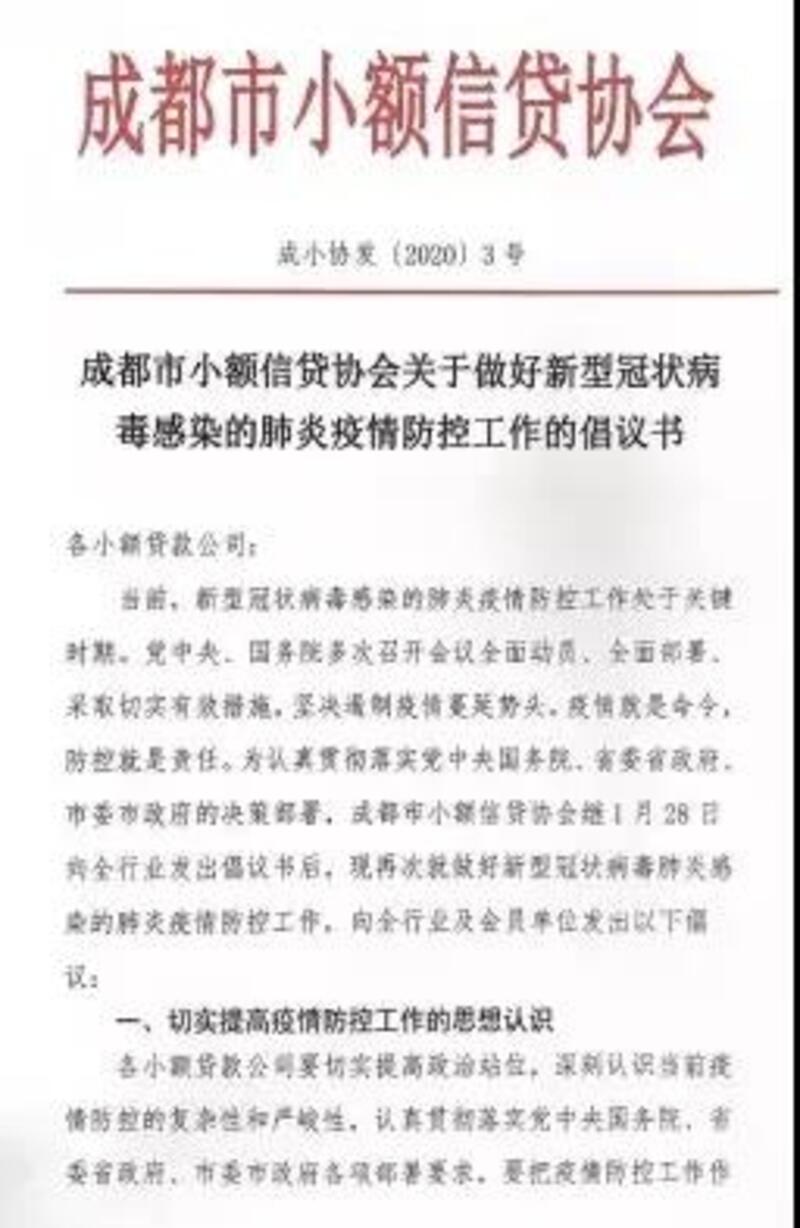 面对新型冠状病毒肺炎疫情,成都市小额信贷协会积极落实党中央、国务院决策部署,按照监管部门工作要求,充分发挥社会组织平台作用,坚定信心、同舟共济、科学防治、精准施策,组织并协助成都小贷机构开展依法科学有序防控。