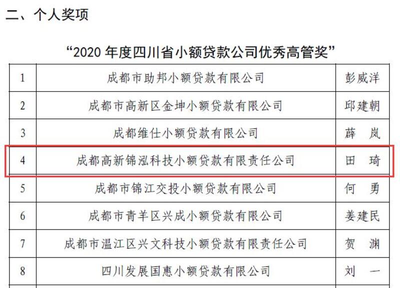 产业集团下属成都高新锦泓科技小额贷款有限公司(以下简称锦泓科贷)荣获“2020年度四川省小额贷款公司小微金融服务奖”,公司总经理田琦荣获“2020年度四川省小额贷款公司优秀高管奖”,公司员工2人荣获“2020年度四川省小额贷款公司小贷之星”,代表着锦泓科贷的工作成绩获得了行业各界以及广大客户的充分肯定和认可。