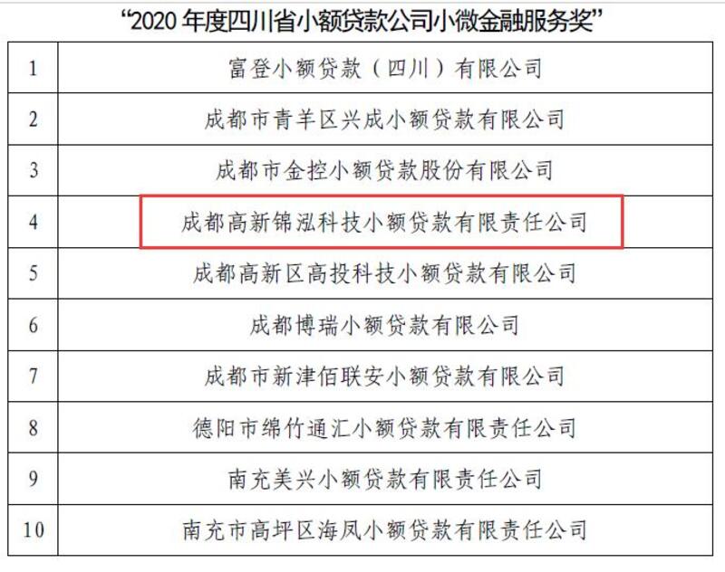 近日,四川省小额贷款公司行业协会公布“2020年度四川省小额贷款公司行业优秀企业和个人评选”活动的获奖情况。本次评选根据川内近300家小贷公司经营质量等多项指标进行择优评选,并经专家组评定确认。