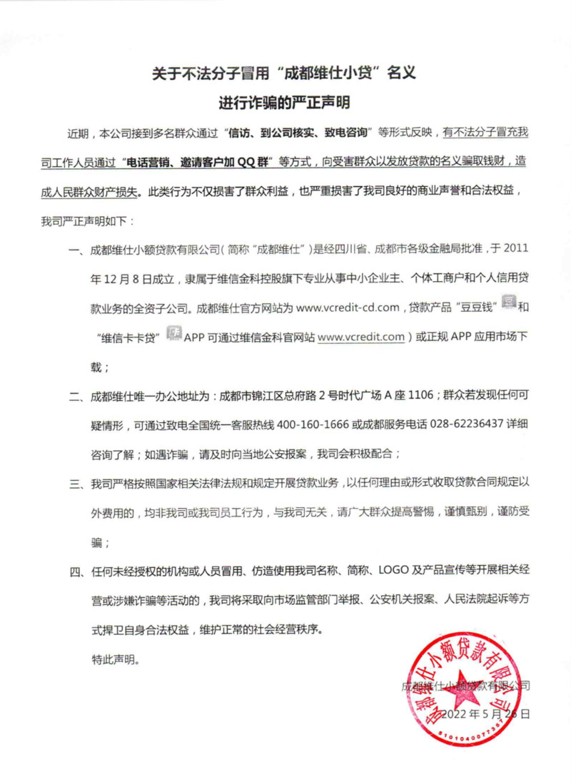 1. 成都维仕小额贷款有限公司(简称“成都维仕”)是经四川省、成都市各级金融局批准,于2011年12月8日成立,隶属于维信金科控股旗下专业从事中小企业主、个体工商户和个人信用贷款业务的全资子公司。成都维仕官方网站为www.vcredit-cd.com,贷款产品“豆豆钱”和“维信卡卡贷”APP可通过维信金科官网站www.vcredit.com)或正规APP应用市场下载;